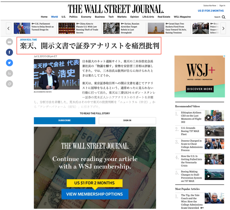 (参照:ウォールストリートジャーナル「楽天、開示文書で証券アナリストを痛烈批判」)