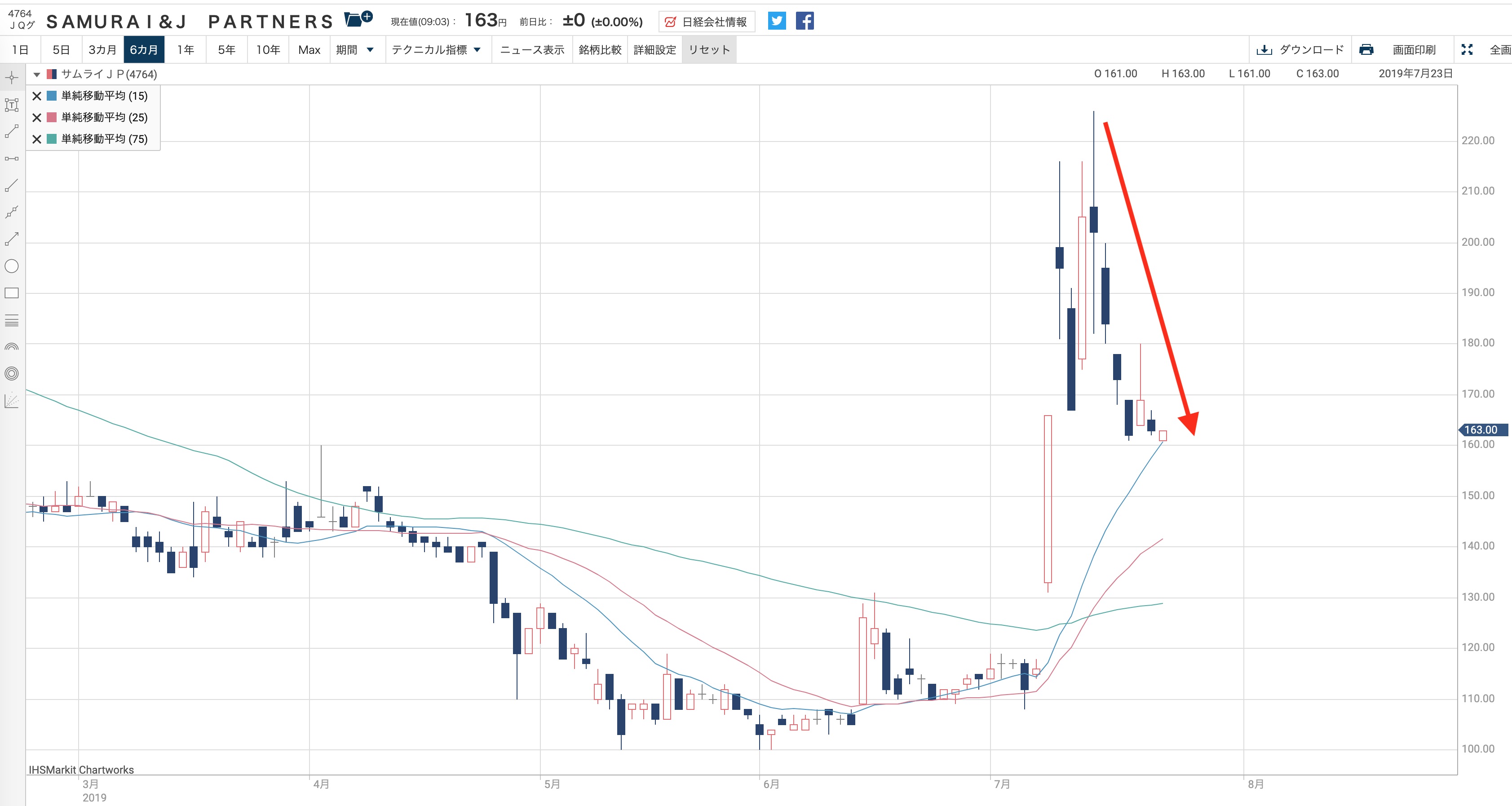 そこから株価は徐々に下落。