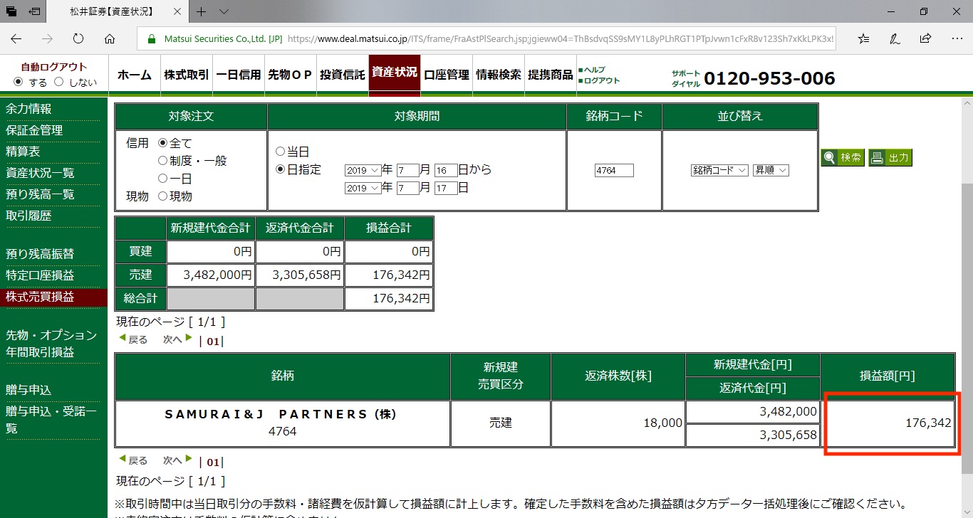 ▼サムライJパートナーズ 176,342円の利益